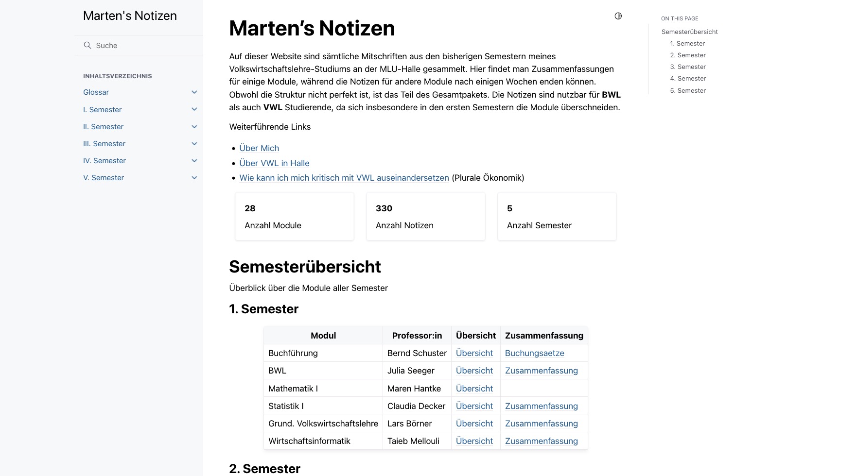 Wer zum ersten Semester in ein Studium reinstolpert, wird erstmal komplett überfordert sein von all den verschiedenen Anforderungen die an einen gestellt werden. Um den Prozess ein bisschen zu vereinfachen, habe ich alle meine Mitschriften für mein gesamtes Studium VWL/BWL an der MLU Halle als Website veröffentlicht.